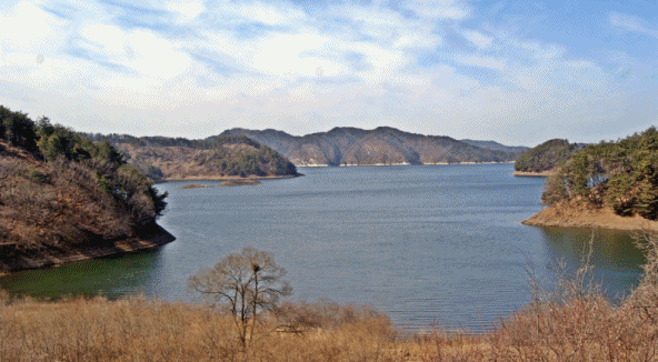 가호리 땅끝. 대전 직동과 내탑동 사이로 파란 호수가 펼쳐진다. 손에 잡힐 듯한 야트막한 산들은 예전엔 어느 동네의 뒷산 정도 됐겠지만 지금은 호수 위에 놓인 섬 같은 곳이 됐다. 물이 좀 빠지면 육지로 연결될 산들이다. 그곳엔 옛 마을의 흔적들이 남아 있겠지? 지금은 억새와 갈대밭, 그리고 동복 오씨 묘소가 쓸쓸함을 대변한다. 그래도 대청호 오백리길에서 만나는 묘소가 늘 그렇듯 이곳 역시 빼어난 풍광을 자랑한다. 눈앞엔 첩첩산중이 펼쳐지고 그 사이 사이로 유유히 흐르는 금강이 머릿속에 그려진다.