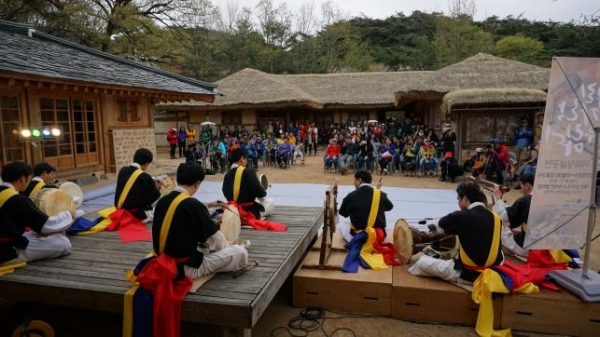 충남문화재단이 주최하고 민족음악원(이사장 이광수)이 주관하는 우리가락우리마당 야외상설 첫 공연이 지난 18일 오후 2시 예산 수덕사 수덕여관 초가집 앞마당 야외무대에서 열렸다. 이날공연에는 사물놀이 창시자인 이광수의 비나리와 사물놀이와 퉁소와 사자춤 등 수준높은 다양한 프로그램으로 진행됐다. 충남문화재단 제공