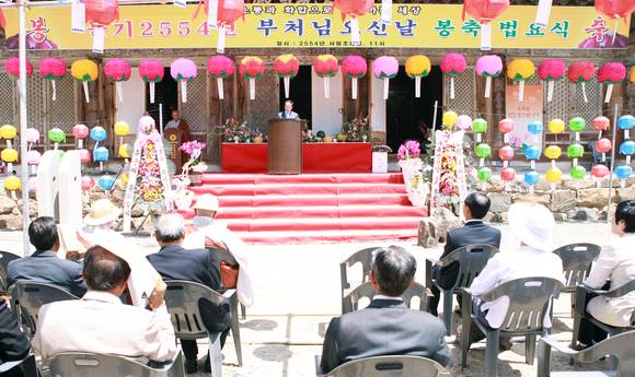 석가탄신일인 지난 21일 공주 마곡사에서 열린 봉축 법요식 모습. 불기 2554년 부처님 오신 날인 지난 21일 충남 공주 마곡사와 예산 수덕사에서 봉축 법요식이 열렸다.마곡사에선 법요식과 함께 지난 3월 입적한 법정 스님의 무소유 정신을 기리기 위한 ‘숲 속의 작은 도서관’ 행사가 열렸고, 마곡사와 인연이 있는 백범 김구 선생의 일대기를 판소리로 재현해 낸 임진택 명창의 창작 판소리 ‘백범 김구’ 공연도 진행됐다.수덕사에서도 정종환 국토해양부 장관 등 1000여 명이 참석한 가운데 봉축 법요식이 거행됐다.