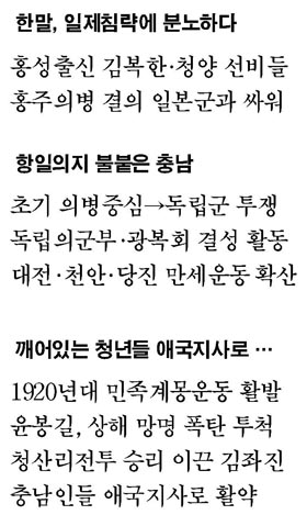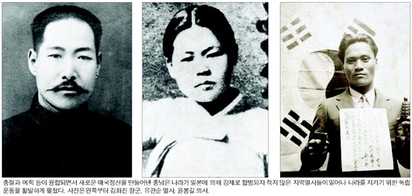 충의와 절의정신에 의해 결사대 5000명을 이끌고 백제를 지키려 했던 계백 장군과 백제의 멸망을 앞두고 왕에게 직언을 했던 성충과 흥수, 기존의 학문을 탈피해 실천을 강조했던 예학(禮學), 다른 양반들과 차별화를 꾀했던 선비. 충남을 대표하는 문화들이 융합되면서 새로운 애국정신을 만들어낸 충남은 19세기 말부터 항전을 준비하더니 20세기 들어와 빛을 발한다. 나라가 일본에 의해 강제로 합병되자 적지 않은 열사들이 일어나 나라를 지키기 위한 활동에 돌입한 것이다. 앞서 소개했던 충남의 5대정신과 문화들이 융합돼 충남에서는 여러 형태의 독립운동이 일어났다.