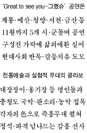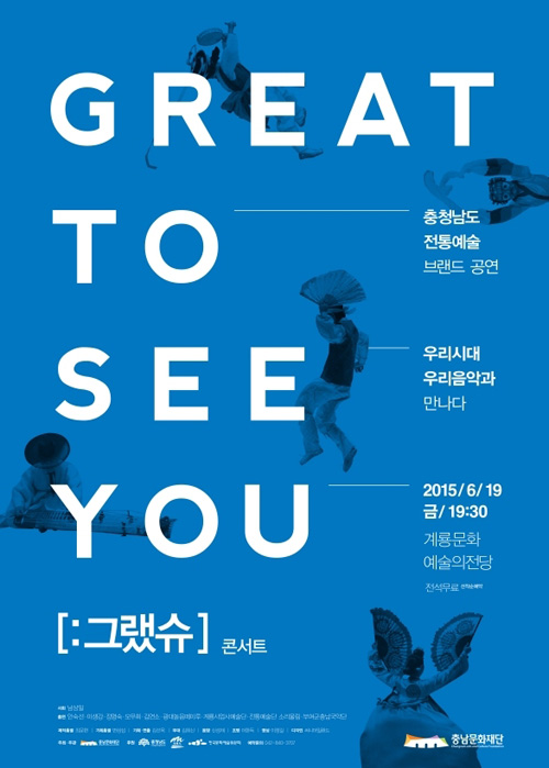충남문화재단(대표이사 이종원)이 야심차게 기획한 충남 전통예술 대표 브랜드공연 ‘Great to see you[:그랬슈]’ 콘서트가 오는 19일 계룡문화예술의전당에서의 첫 무대를 시작으로 연말까지 대장정에 들어간다.