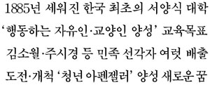 ‘행동하는 자유인·교양인 양성’에 교육목표를 둔 배재학당은 한국 최초의 서양식 대학기관이었다. 배재학당의 형태와 목표는 조선 기존의 그것과는 확연히 달랐다. 신분적 제약을 넘어서는 교육방식을 채택해 누구나 와서 공부할 수 있었고 정해진 수업시간과 수업계획, 명문화된 학칙에 따라 운영됐다. ‘크고자하거든 남을 섬기라’(마태복음 20장 26절·欲爲大子 當爲人役)는 교훈아래 학생들에게 자유주의 교육을 실천하고 스스로 남에게 봉사하는 섬김의 정신을 함양토록 했다. 배재학당은 130년 동안 나눔과 섬김의 바탕으로 한 교훈 아래 지금까지 학당동문 10만 명, 대학동문 5만 명 등 15만 명의 인재를 배출했다.