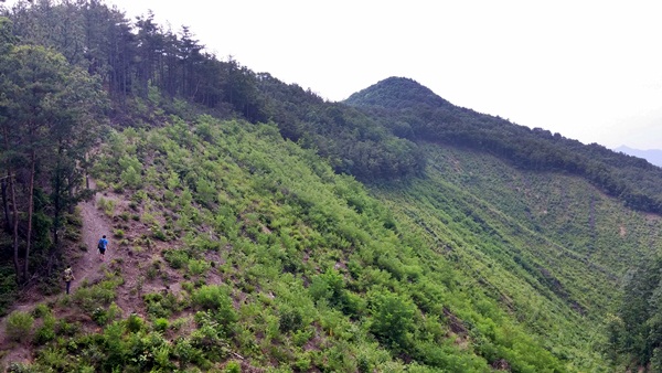 두 번째 며느리재에서 마성산 정상으로 향한다. 정상까진 1.6㎞다. 정상으로 향하는 길에 산성(늘티산성) 터를 지난다. 며느리재에서 오르락내리락 능선을 타고 대략 1시간, 숨이 꼴딱 넘어가는 가파른 오르막을 조금 오르면 옥천 읍내가 한 눈에 들어온다. 교동리 마성산(409m) 정상이다.