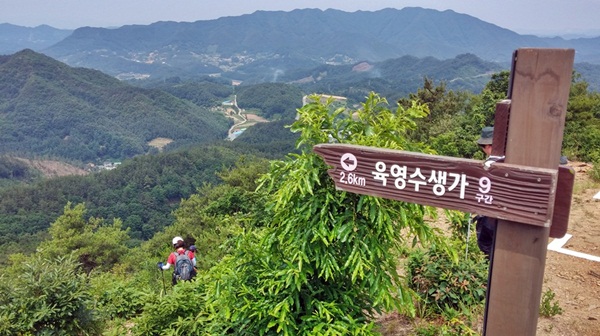 올 겨울 칼바람을 맞으며 오대리 앞에 웅장하게 펼쳐진 강줄기를 바라봤던 10구간과 겹치는 곳이다. 여부터 며느리재(Ⅱ)까지 대략 150m가 10구간과 겹친다. 6개월 전에 봤던 그 장쾌한 풍경을 다시 눈에 담는다. 우리 일행을 힘들게 했던 이슬봉도 눈에 들어온다. 힘이 들었지만 그래도 가장 멋진 대청호의 장관을 선사했던 곳이다.