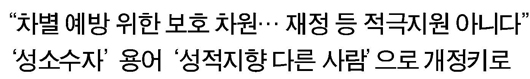이어 “문제가 된 성소수자 용어는 국가인권위원회법 제2조 3호에 있는 ‘성적 지향이 다른 사람’ 등으로 개정할 것”이라며 “‘지원’이라는 부분이 당초 취지와 달리 오해의 소지가 있기 때문에 조례 제정의 목적이었던 ‘차별에 대한 보호 및 지원’으로 내용을 구체화하겠다”고 강조했다.