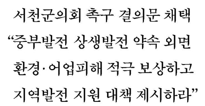 이날 서천군의회는 한국중부발전은 신서천발전소 건설 이행협약과 주민설명회 공약을 성실히 이해하고 지역발전 기여의 실효성 있는 이행을 촉구했다.