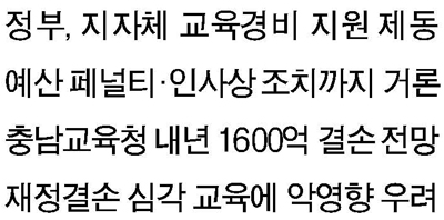 충남교육청은 교육재정교부금 배분방식 변경과 누리과정 부담 등으로 내년 재정결손이 1600억 원에 달할 것으로 예상되는 가운데 지자체의 교육경비 보조마저 큰 폭으로 줄 것으로 보여 교육재정이 더욱 악화될 전망이다.