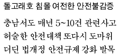 안전불감증, 대처 부족, 예방과 점검 부재가 파생시킨 낚싯배 사고에 대한 우려는 충남 지역도 예외는 아니다. 지난 6월 충남 보령 오천항 인근에서 낚시배와 바지선이 충돌해 2명이 숨지고 3명이 중상을 당하는 사고가 발생해 불안감을 키웠다. 매년 5∼10건의 관련 사고가 잇따르는 점도 충남이 결코 낚싯배 안전지대가 아니라는 방증이다.