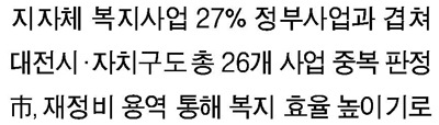 지방자치단체 복지사업이 우후죽순 늘어나면서 복지 대상자의 혼란과 불편도 증가하고 있다. 수혜자 간 형평성을 저해한다는 비판도 제기되고 있다. 이에 정부가 전국 지자체와의 복지사업 정비를 진행하고 있는 가운데 대전시도 정부 복지사업과 중복되는 복지사업을 정비하기 위한 용역에 착수한다.