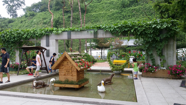 인공폭포 아래 연못에는 300여 마리의 비단 잉어가 떼 지어 다녀 방문객에게 즐거움을 선사한다.