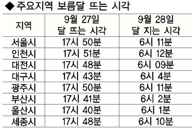 이번 한가위 보름달은 아직 완전히 둥근 모습은 아니지만 점점 차올라 추석 다음날인 28일 오전 11시 50분 완전히 둥근 모습이 된다고 천문연은 설명했다. 이 때 달은 지평선 아래로 내려가 진 후이기 때문에 가장 둥근 추석 보름달은 지기 시작한 28일 오전 6시 11분 서쪽 지평선에서 볼 수 있다.