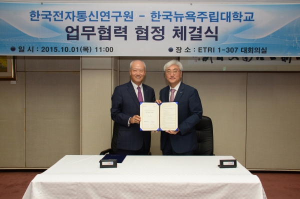한국전자통신연구원(ETRI)은 1일 원내에서 한국뉴욕주립대와 ICT(정보통신기술) 관련 기술협력을 위한 업무협약을 체결했다.