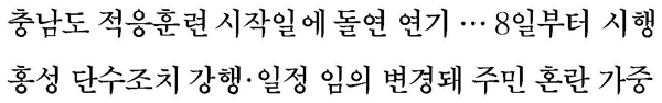 도는 지난달 30일까지만 해도 충남 서북부지역 제한급수 조치가 5일부터 시행된다고 예고했다가 적응훈련이 시작되는 1일 갑작스럽게 8일로 연기했다. 연기 사유에 대해서도 공식적으로는 특별한 설명을 하지 않았다.