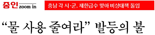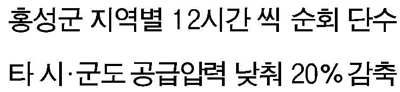 이에 따라 각 시군이 제한급수에 대비해 용수 사용절감을 위한 다양한 시책을 제시하고 있는 가운데 홍성군(1일 평균 사용량 3만 3617톤)이 가장 강력한 지역별 순회 단수조치를 구상하고 있다.
