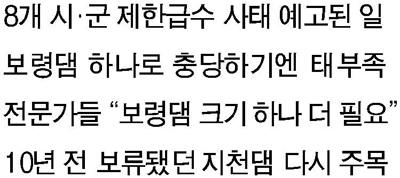 이에 따라 2000년대 초반 거론됐다가 수면 아래로 가라앉은 지천댐과 마곡댐 건설의 필요성이 다시 부상하며 공론화되기 시작하고 있다.