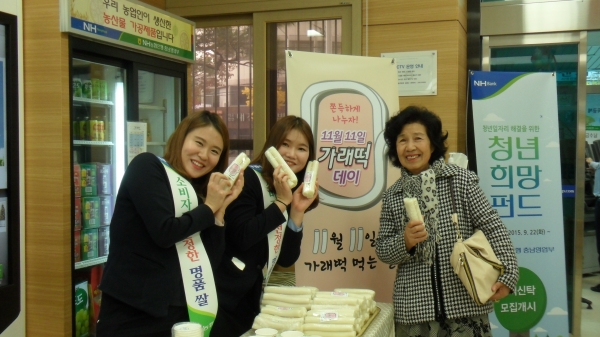 10일 오전 대전 중구 대사동 농협중앙회 충남지역본부에서 열린 2015 가래떡데이 행사에 참가한 NH농협은행 직원들이 충남 쌀 소비촉진을 홍보하며 고객에게 가래떡을 나눠주고 있다. 농협중앙회 충남지역본부 제공