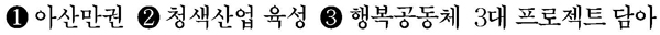 새로 추가된 3대 핵심 프로젝트는 중점 및 핵심 사업 가운데 연계 가능한 사업을 영역별로 묶어 시너지 효과를 극대화하기 위해 마련됐으며 ▲아산만권 프로젝트 ▲청색산업 육성 프로젝트 ▲행복공동체 프로젝트 등으로 구성됐다.