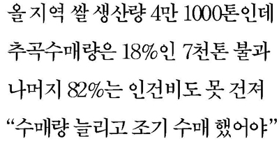 농민들은 “3년 연속 대풍을 이룬 국내 산지 쌀값은 80㎏들이 가마당 14만~15만 원 선인데 반해, 현재 정부에서 수매하는 추곡수매값은 80㎏ 가마로 환산하면 18만 원 선이기 때문에 인건비, 농기계 임대료 등 제반비용을 생각하면 정부가 좀 더 일찍 수매하고, 수매량을 늘렸어야 농민의 손해가 줄어든다”고 주장하고 있다.