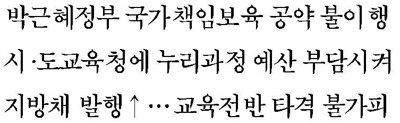 문제는 당초 예상대로 지방교육재정교부금이 증가하지 않았다는 점이다. 도입 당시 정부는 지방교육재정교부금이 2011년 35조 3000억 원에서 올해 49조 4000억 원으로 증가할 것으로 내다보며 이에 맞춰 재정계획을 수립했다. 이 과정에서 시·도교육청과의 세부적인 논의는 없었던 것으로 알려졌다. 하지만 올해 지방교육재정교부금은 39조 4000억 원에 그쳤다. 예상과 10조 원가량 차이다. 이는 결국 시·도교육청의 부담으로 전이됐다. 올해 전국 교육청의 지방채가 공교롭게도 10조 8540억 원이다. 이는 2012년 2조 769억 원의 5배 수준이다. 내년에는 정부 지원금 3000억 원을 제외하고도 1조 8000억 원이 부족해 지방채를 또 발행해야 하는 처지다.