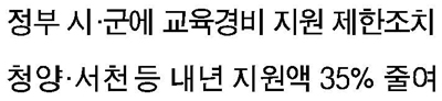 충남도 내 일부 자치단체가 내년도 교육경비 지원 예산을 대폭 줄인 것은 정부가 지방세 수입 등으로 인건비를 해결하지 못하는 지자체에 대해 교육경비 보조 예산을 편성하지 못하도록 한 ‘지방교육경비 지원 관련 규정’에 따른 것이어서, 교육경비 제한 조치로 인한 교육재정 악화가 현실화되고 있다는 분석이다.
