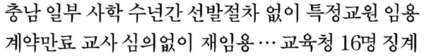 충남지역 일부 사학이 수년간 선발절차를 거치지 않고 특정 기간제교원을 임의 임용하는 등 부적정하게 교사들을 채용해 온 것으로 밝혀져 물의를 빚고 있다.