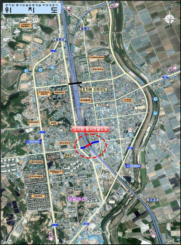 조치원 동서연결도로는 경부선 철도를 지하로 횡단하는 270m의 철도횡단 도로로, 오는 2019년까지 4년 간 360억 원이 투입돼 건설하게 된다.