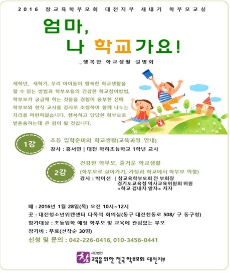 참교육학부모회 대전지부(지부장 이건희)가 초등학교 예비학부모들을 위해 ‘새내기 학부모교실-엄마, 나 학교 가요’를 개설한다.