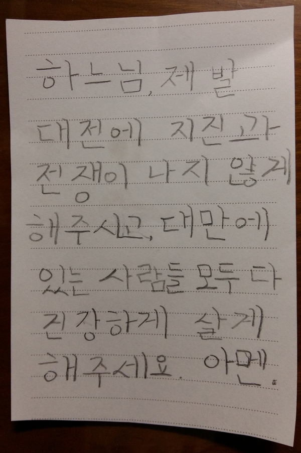 대전의 한 초등학생이 대만 지진 사태[지난 6일 진도 6.4의 강진으로 타이난(台南)시에서 총 116명 사망], 북한의 장거리 로켓 발사에 따른 남북 긴장관계 심화 등과 관련해 자신의 소망을 적은 편지를 써 보는 이들의 가슴을 먹먹하게 하고 있다.