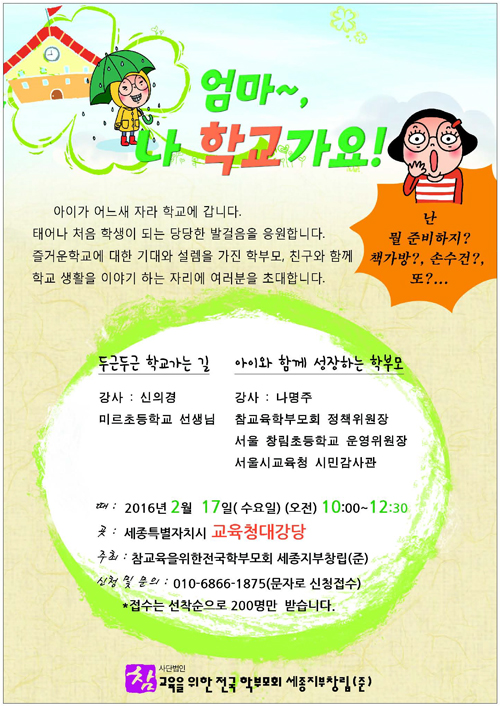 사)참교육을위한전국학부모회 세종지부창립(준)에서는 오는 2월17일 교육청 대강당에서 새내기초등학부모를 위한 강좌를 개최한다.