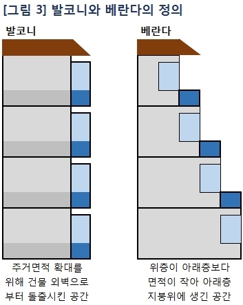 현행 건축법 시행령에 따르면 발코니는 주거공간 연장을 위해 건물 외벽으로부터 돌출시킨 공간을 뜻한다. 반면 베란다(그림 3)는 공동주택에서 위층이 아래층보다 바닥면적이 작아 아래층 지붕 위에 생긴 여분 공간을 말한다.