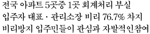 그러면서 정부는 “무엇보다 아파트 관리 비리 방지체제가 제대로 작동하기 위해서는 아파트 관리에 대한 입주민들의 관심과 자발적인 감시 참여가 무엇보다도 중요하다"고 당부했다.