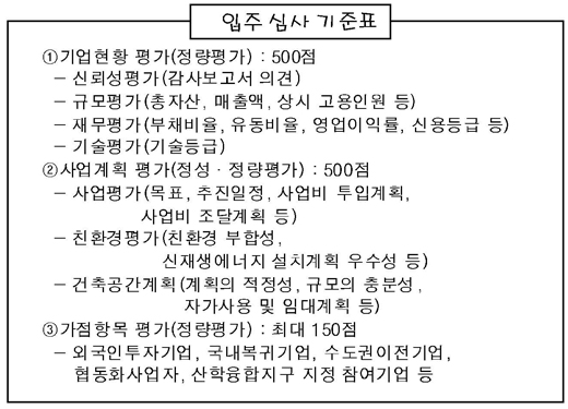 입주기업 선정은 행복청·세종시·민간위원(경제·산업분야, 도시계획분야, 법률·회계·환경분야 전문가 12명)으로 구성된 ‘세종테크밸리 정책심의위원회’에서 입주기업 현황(500점) 및 사업계획(500점)을 심사·평가해 결정하며, 수도권 이전기업 및 국내복귀 기업에는 최대 150점의 가점이 부여된다.