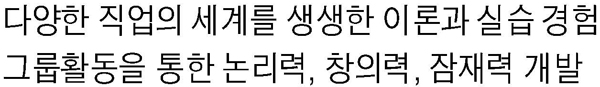 그러나 이러한 일들은 책상위에서 이루어지지 않습니다. 수많은 경험을 통해 시행착오를 겪으면서 문제해결능력과 의사결정능력을 신장시킬 것입니다. 그리고 그 과정에서 느낀 성취감은 불안한 미래에 대한 자기확신과 믿음을 만들것이며 새로운 것에 도전할 용기와 긍정적인 자아를 형성할 것입니다.