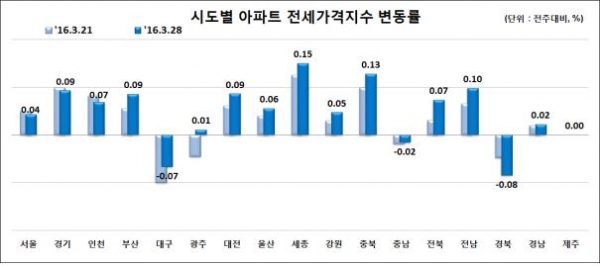 이 기간에 충북 아파트 전셋값도 0.13% 올라 전국에도 두 번째로 높은 상승세를 보였으며, 대전 아파트 전세값은 0.09% 올랐다. 봄철 이사수요와 신혼부부 수요로 상승세를 이어갔다.