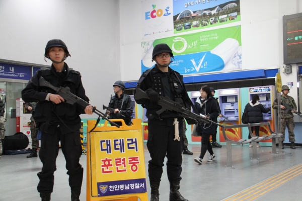 충남지방경찰청은 4·13 총선 틈탄 불순세력들의 테러에 대비하기 위해 천안에 있는 경찰관기동대를 대테러긴급진압부대로 편성, 천안역과 두정역, 성환역, 터미널, 천안아산역, 온양온천역, 대형백화점 등 다중운집시설에 전진 배치했다. 충남지방경찰청 제공