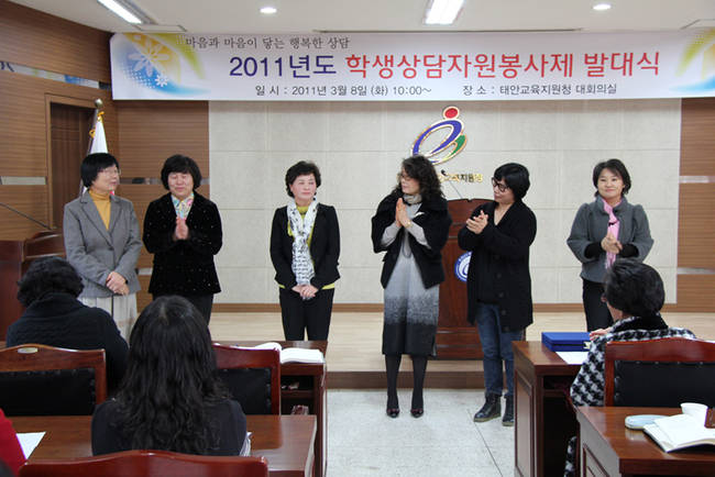 태안교육지원청과 학생상담자원봉사자들은 8일 ‘학생상담자원봉사제 발대식’을 갖고 학생들의 바른 인성함양을 도모하는 지역교육 공동체의 역할을 성실히 수행하기로 다짐했다. 이날 발대식을 갖은 자원봉사자 20명은 올 한 해 동안 태안군내 각급 학교에서 집단 학생상담을 맡아 학생들의 건전한 성장을 지도할 예정이다.김동성 태안교육장은“ 지금까지 각급 학교에서 학생상담과 생활지도에 노력해 준 자원봉사자들에게 감사드린다”며 “새로운 임원진과 신규 자원봉사자들도 선배들의 열정을 이어받아 태안교육 발전에 노력해 달라”고 당부했다.