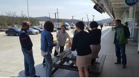 중앙고속도로 원주(부산·춘천방향)휴게소(소장 이관수) 직원이 5일 식목일을 맞아 고객들에게 과실수 묘목을 나눠주며 나무심기 분위기를 조성하고 있다. 원주휴게소 제공