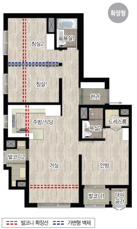 65㎡형(구 28평)은 2면 발코니 적용으로 확장시 약 5.97평의 실사용 면적이 추가되고 가변형 벽체를 적용해 가족구성원에 맞게 침실분리형, 침실통합형으로 구분해서 인테리어 할 수 있다.
