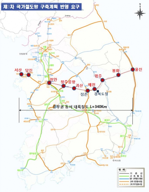 앞서 노선통과지역 12개 시장 군수로 구성된 시장·군수협력체 대표 구본영 천안시장과 이현준 예천군수, 장욱현 영주시장, 박노욱 봉화군수, 임광원 울진군수는 4일 오전 국토교통부를 방문해 현재 추진 중인 제3차 국가철도망 구축계획에 ‘중부권 동·서 내륙철도’ 건설을 반영해줄 것을 건의했다.