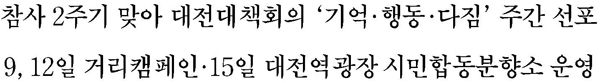 오는 9일과 12일 이틀간 으능정이 거리에선 세월호 참사 진상 규명을 위한 노란 리본 나눔 캠페인이 펼쳐지며 13일 오후 7시 대전 평화의 소녀상 앞에선 세월호 희생자와 일본군 위안부 피해자를 위한 천도재가 원불교 대전충남교구 여성회 주관으로 엄수된다.