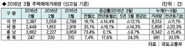 춘삼월에 대전, 충남·북 지역의 주택매매 및 전월세 거래량이 지난해 같은 기간보다 감소한 것으로 나타났다. 대출 규제 강화 영향 때문으로 풀이된다.