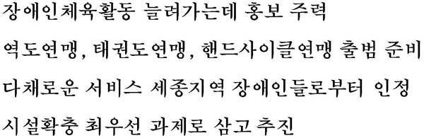 세종시에는 장애인을 위한 체육시설이 전무하다. 그래서 체육시설 확충에 모든 행정력을 집중하며 노력을 기울이고 있다.