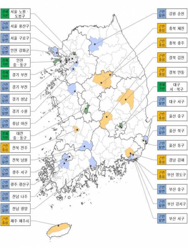 동구·중구 등 5곳이 올해 경제기반형 도시재생사업으로, 중심시가지 근린재생형 9곳, 일반 근린재생형 19곳 등 총 33곳이 ‘2016년도 도시재생사업’ 지원 대상지역으로 선정됐다. 이번에 확정된 33곳은 지난해 지방자치단체 공모를 통해 선정됐다.