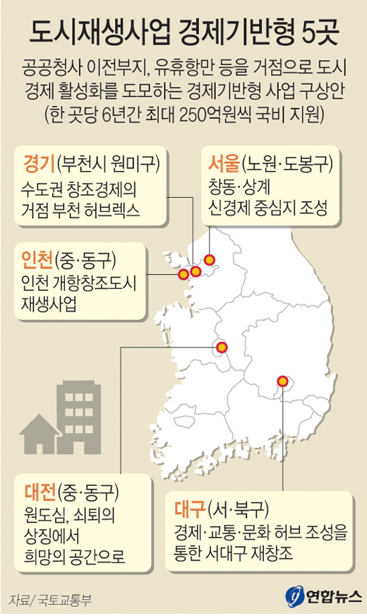 경제기반형사업은 공공청사 이전부지, 유휴항만 등을 거점으로 도시경제 활성화를 도모하는 사업으로, 5곳에 6년간 최대 250억 원을 지원한다.