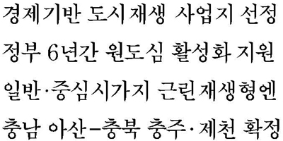 충북 충주와 제천은 ‘중심시가지 근린재생형’으로, 충남 아산은 ‘일반 근린재생형’ 사업지로 각각 지정돼 지역별 특화사업이 추진된다.