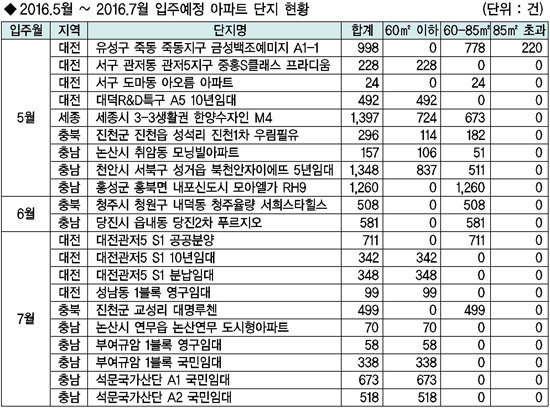 대전은 5월에 죽동 예미지 998세대 등이 입주하고, 세종은 3-3생활권 M4블록 한양수자인 1397세대, 충남은 내포신도시 RH9블록 모아엘가 1260세대 등이 입주를 앞두고 있다. 이 기간에 충북은 진천군 진천읍 성석리 진천 1차 우림필유 296세대 등이 집들이를 한다.