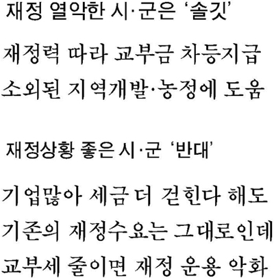 시·군 재정력에 따라 각종 교부금을 차등 지급하겠다는 개혁안에 대해 재정이 열악한 지자체는 기대를, 재정이 상대적으로 좋은 시군은 당장 반대하고 있다.