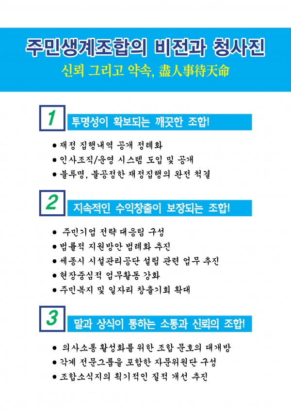 또한 “지역사회 유대관계와 기여를 확대하기 위해 각계 전문그룹을 포함한 자문위원단을 구성하여 전문가를 통한 사업자문과 각종단체와 협력체계를 구축하여 조합을 내실 있게 성장발전시키겠다”고 약속했다.