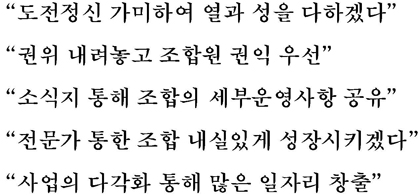 조합장은 “조합원, 대의원님들과 격의 없는 대화 창구를 통해 의사소통을 활성화하고 조합의 문턱을 낮추겠습니다. 평상시 구성원들의 생각과 정서를 읽고 소통함으로써 창의적인 잠재력을 십분 발휘하게 하고 진솔하고 다양한 의견을 수용하여 개방적이고 혁신적이며 변화를 지향하는 조합의 풍토를 만들겠다”고 약속했다.
