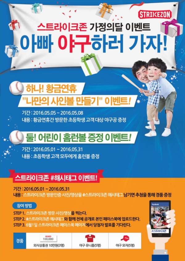 개인 페이스북에 스트라이크존 방문 인증 사진 또는 영상을 ‘#스트라이크존’ 해시태그와 함께 올린 고객에게는 추첨을 통해 외식상품권 10만 원권(3명), 야구 유니폼(5명), 야구 모자(5명) 등 다양한 경품을 제공한다. 추첨은 6월 1일 스트라이크존 홈페이지(www.strikezon.com)를 통해 발표하며, 당첨자에게는 페이스북 메시지가 개별 전송된다.